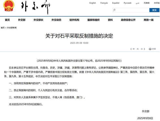 日本首相石破茂宣布辞职的第二天,中国外交部宣布对日本参议员石平发起制裁,冻结其在中国境内的各类财产,禁止其入境中国,同时境内的组织或个人,不得与其开展任何形式的往来,上述措施即日起立刻生效。这应该还是我们首次对日本国会议员发起制裁。
